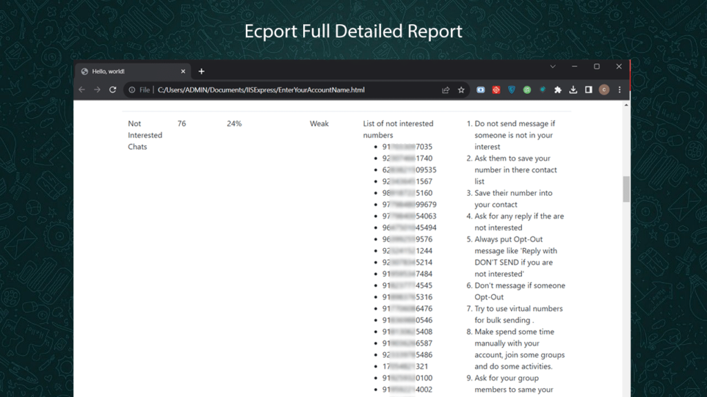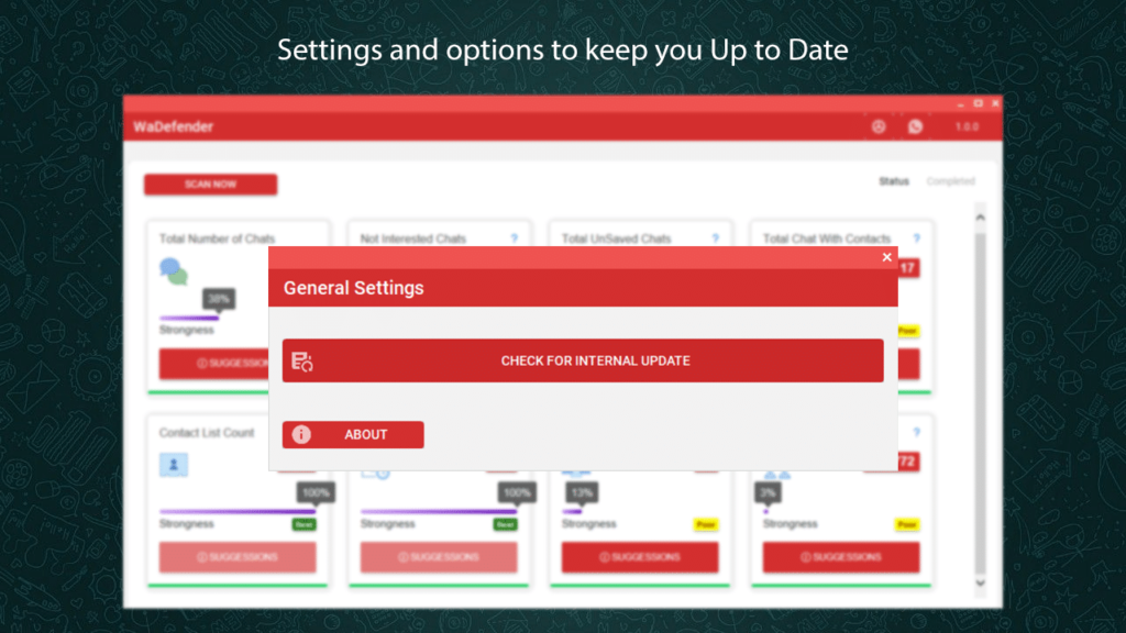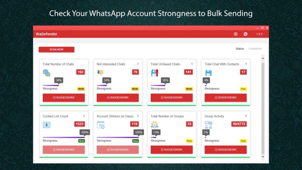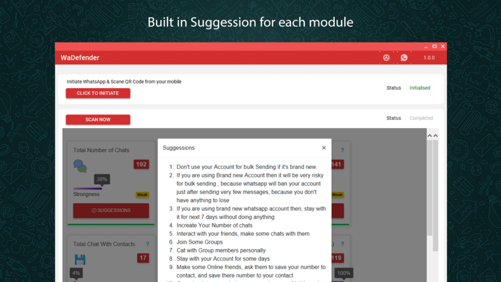 For Example, WhatsApp will ban Your account after sending just 10 to 15 messages if its brand new. In this Software It check your account Oldness. Using this Software you will know the strongness of your whatsapp account so that you can send more messages to your target audience , more strongness means more messages you can send. check your strongness of each Module (i.e. total number of chat) if you account not much stronger then you can follow Suggestions But again there is no any fixed limit as such